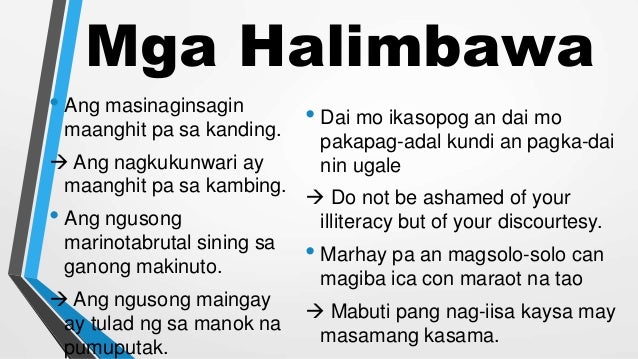 Ang mga wikang Bikol ay mga wikang Austronesyano na ginagamit sa Pilipinas tangi sa tangway ng Bikol sa silangan ng pulo ng Luzon sa pulo ng Catanduanes Burias at sa lalawigan ng Masbate. Iyot mga halimbawa loa mga salitang bicol. Contextual translation of halimbawa ng salitang bicolano to tagalog.