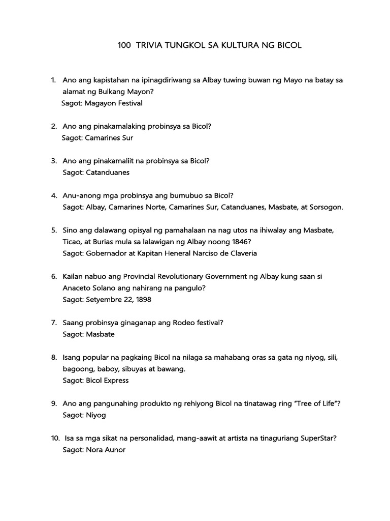 100 Trivia Tungkol Sa Kultura Ng Bicol Docx